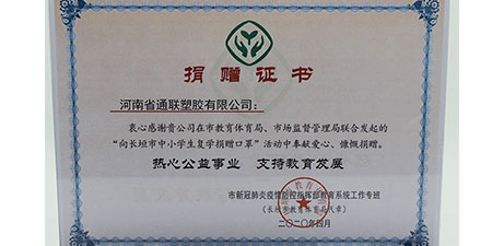 疫情無情人間有愛,河南通聯(lián)塑膠有限公司,體現(xiàn)責(zé)任擔(dān)當(dāng),發(fā)揚(yáng)一方有難,八方支援的協(xié)作精神,通過多方途徑購買到4000只口罩捐贈(zèng)給蕪湖天海,助力蕪湖天海抗擊疫情,復(fù)工復(fù)產(chǎn)。